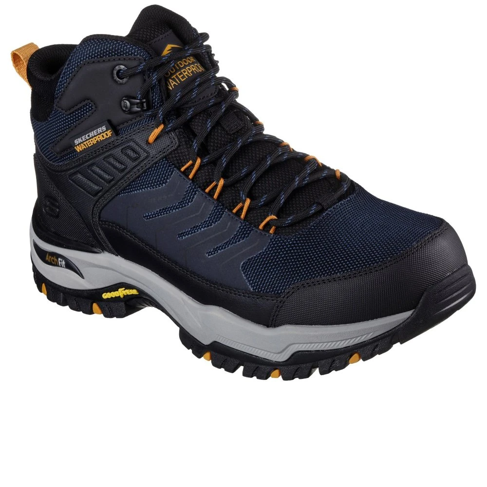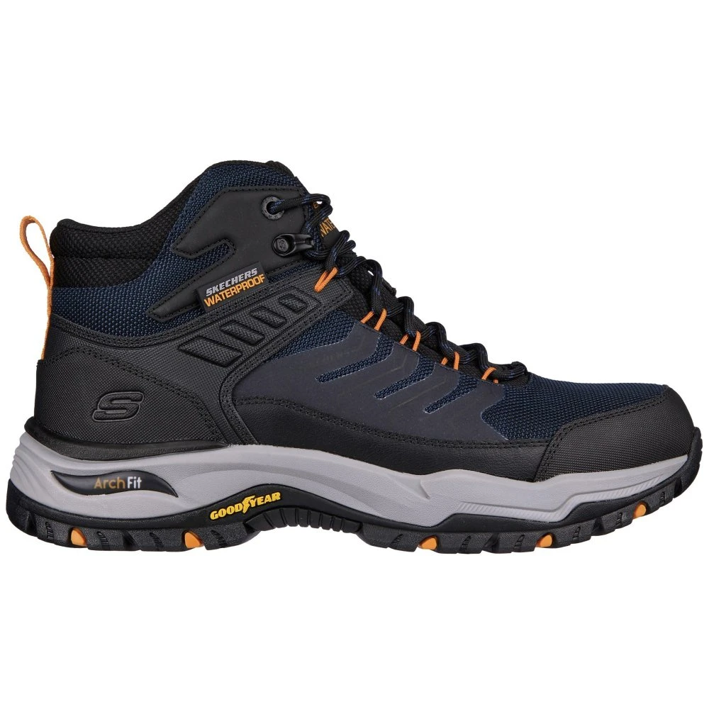 Adventure in rugged comfort and support with Skechers Relaxed Fit: Arch Fit Dawson – Raveno. This lace-up outdoor trail design features a waterproof leather and mesh upper with a removable Arch Fit insole and durable Goodyear Performance Outsole.
