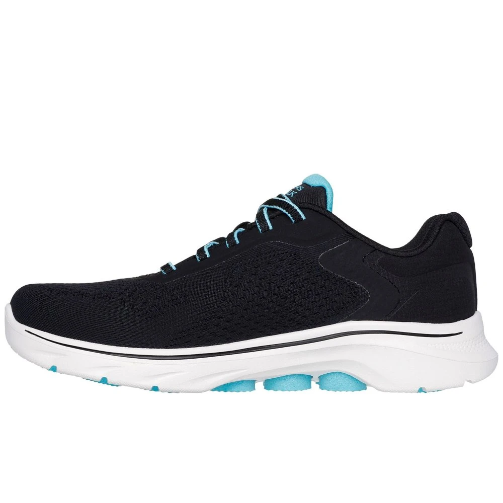 Walk in tech supported comfort with Skechers GO WALK 7 Cosmic Waves. This vegan walking style features an engineered mesh upper with a stretch-laced upper, Skechers Air-Cooled Goga Mat insole and lightweight ULTRA GO cushioning