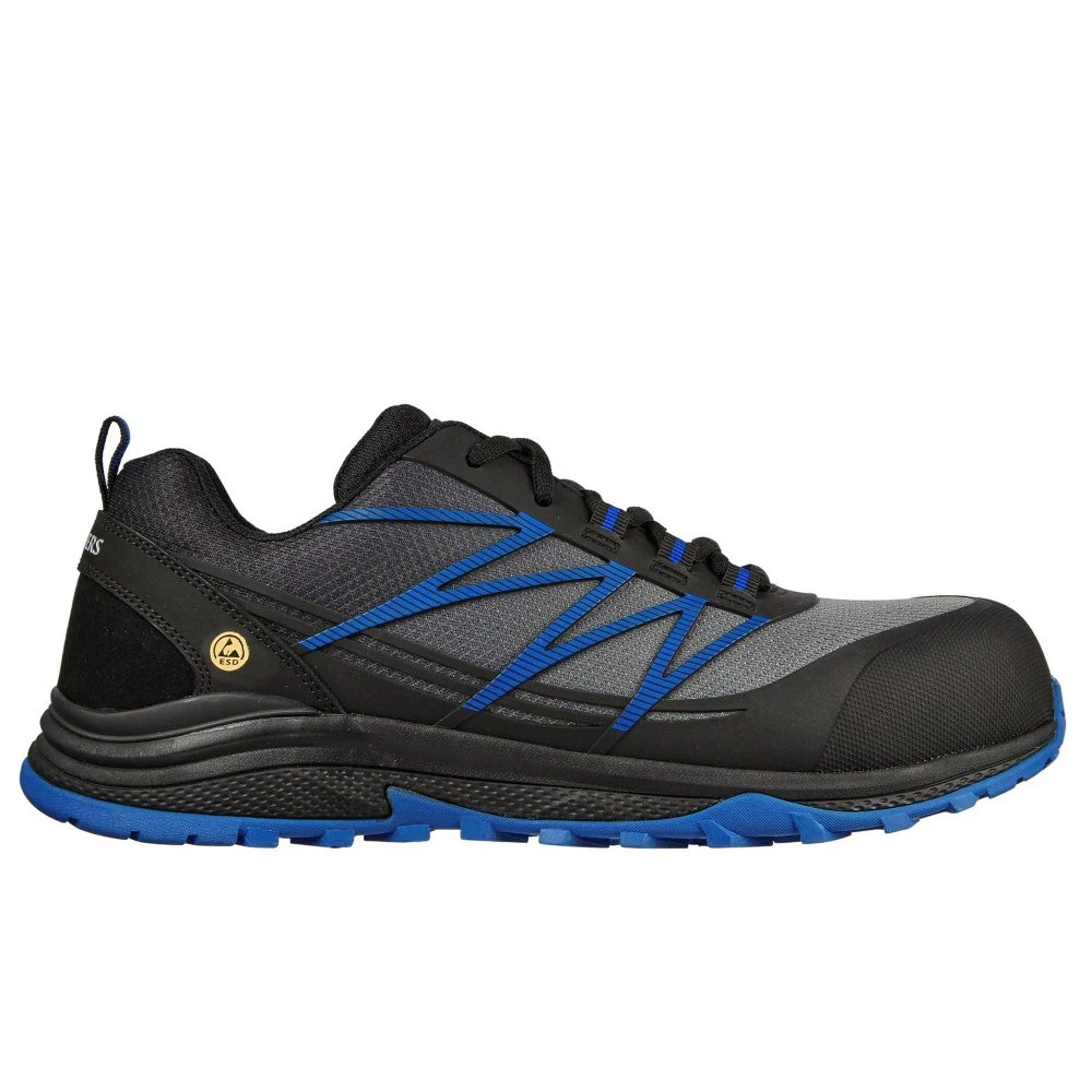 Be ready for every challenge in style and safety with the Skechers Work: Puxal ESD Comp Toe shoe. Smooth leather, synthetic and mesh fabric upper in a lace up sporty composite safety toe Electric Static Dissipative work trainer with stitching accents