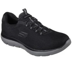 Reach the heights of sporty style and comfort with the Summits shoe. Nearly one piece soft smooth flat knit mesh fabric upper in a bungee laced slip on athletic training sneaker with stitching accents.