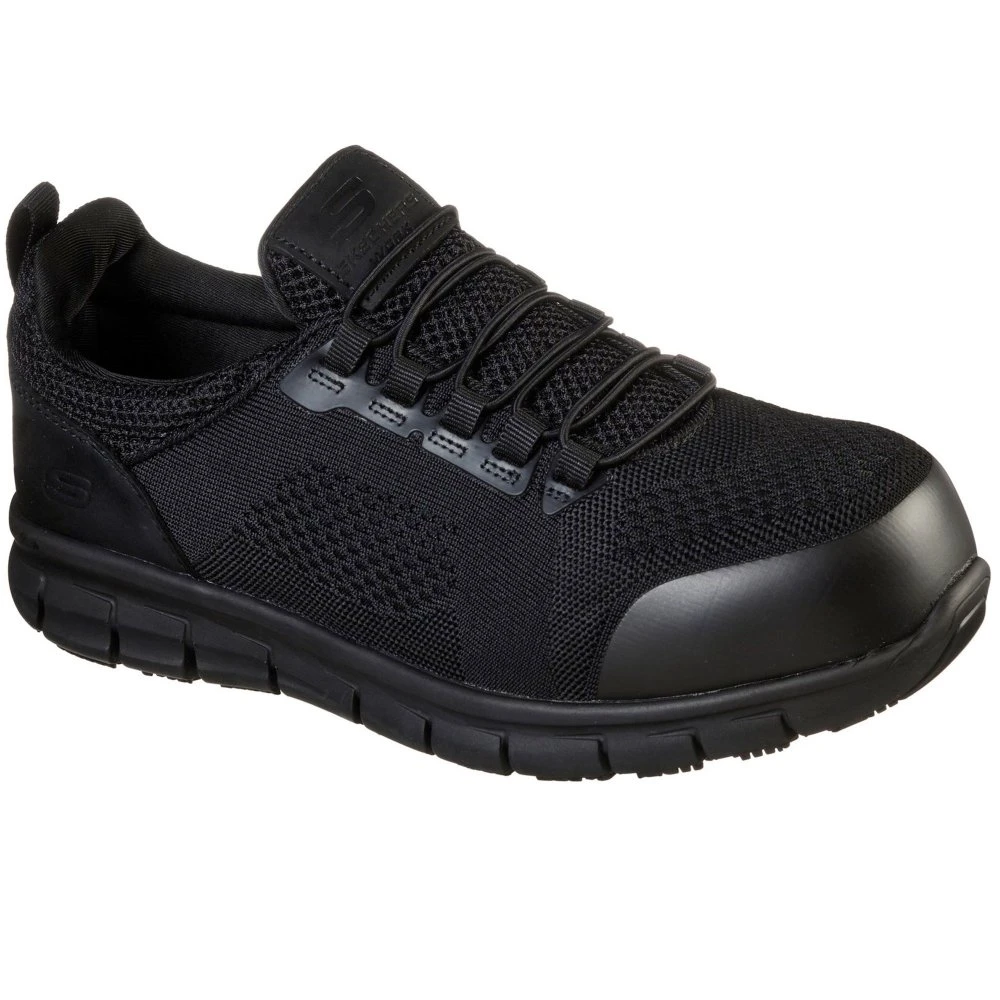 Get right to the comfort and protection with the SKECHERS Work: Synergy – Omat Alloy Toe shoe. Soft woven mesh fabric and smooth synthetic upper in a slip on stretch laced sporty casual slip resistant alloy safety toe work sneaker with stitching.