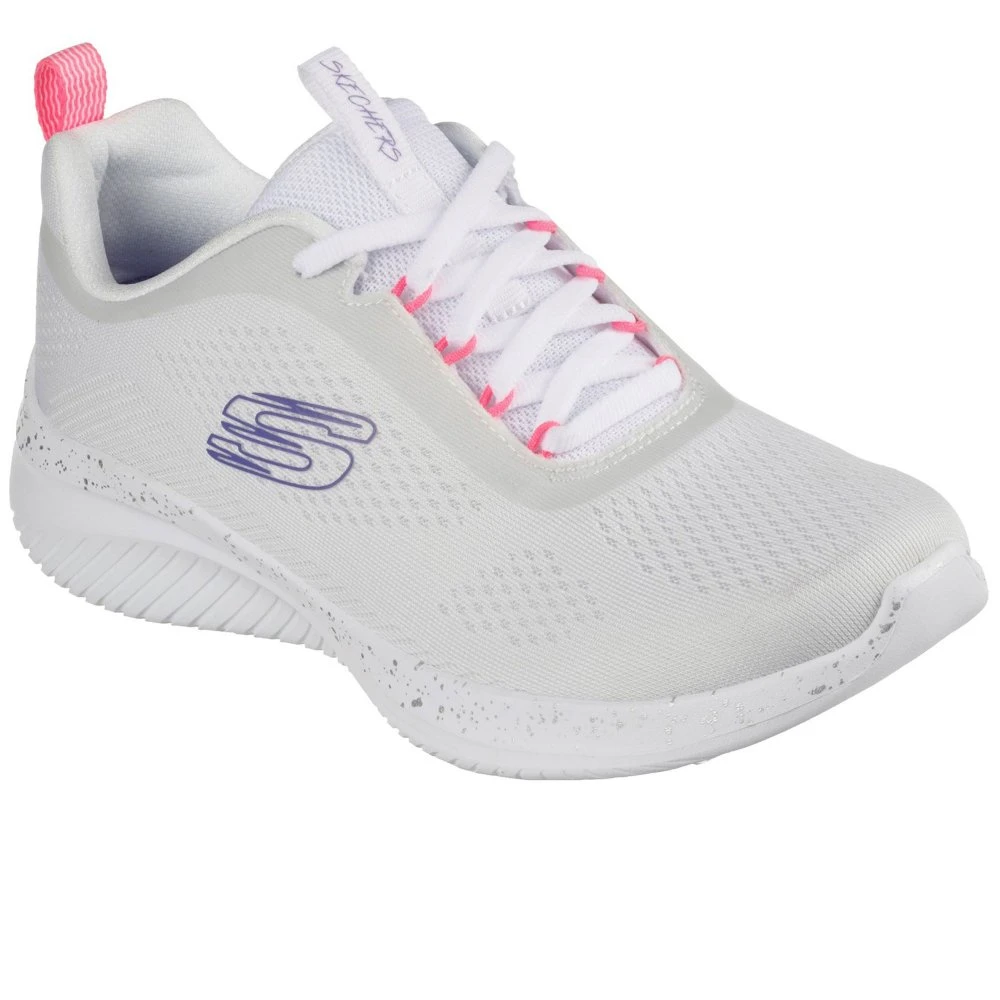 Step in athletic style and flexible comfort with Skechers Ultra Flex. This lace-up features an engineered mesh upper with a Skechers Air-Cooled Memory Foam insole and lightweight speckled midsole.
