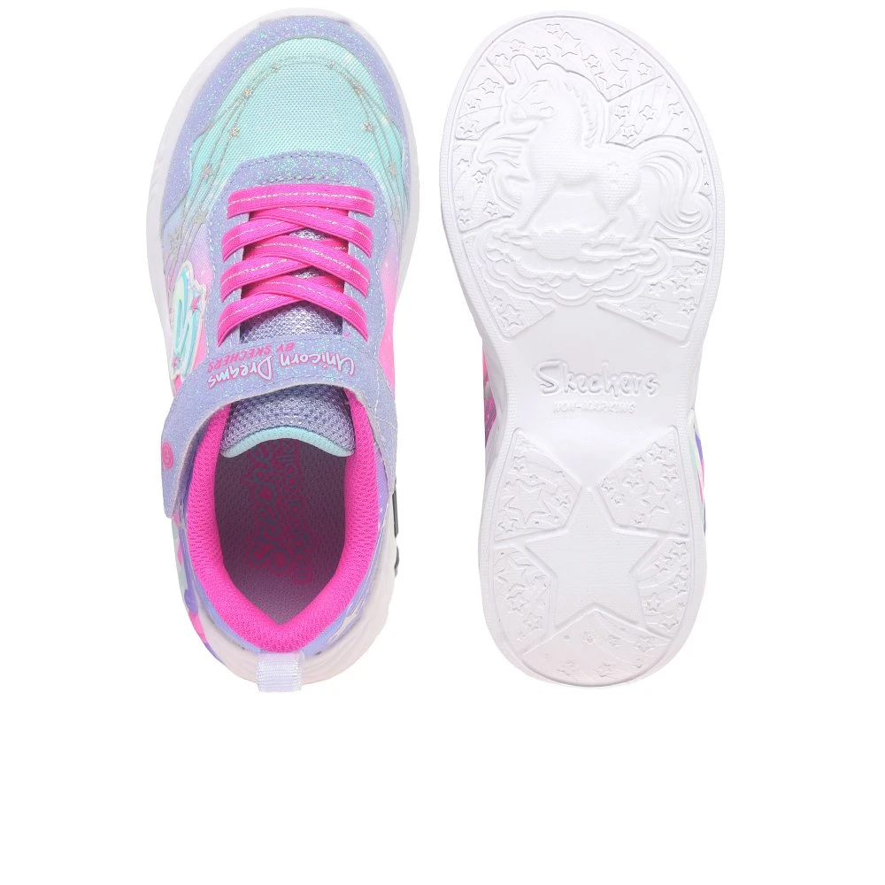 Bring the magic to your everyday with Skechers Unicorn Dreams Lights Girls Trainers, combining the comfort of quality-fitting trainers with a playful unicorn embellished midsole. These unicorn themed light-up trainers feature an ombre synthetic upper with metallic print detail, stretch laces and an adjustable instep strap.Â